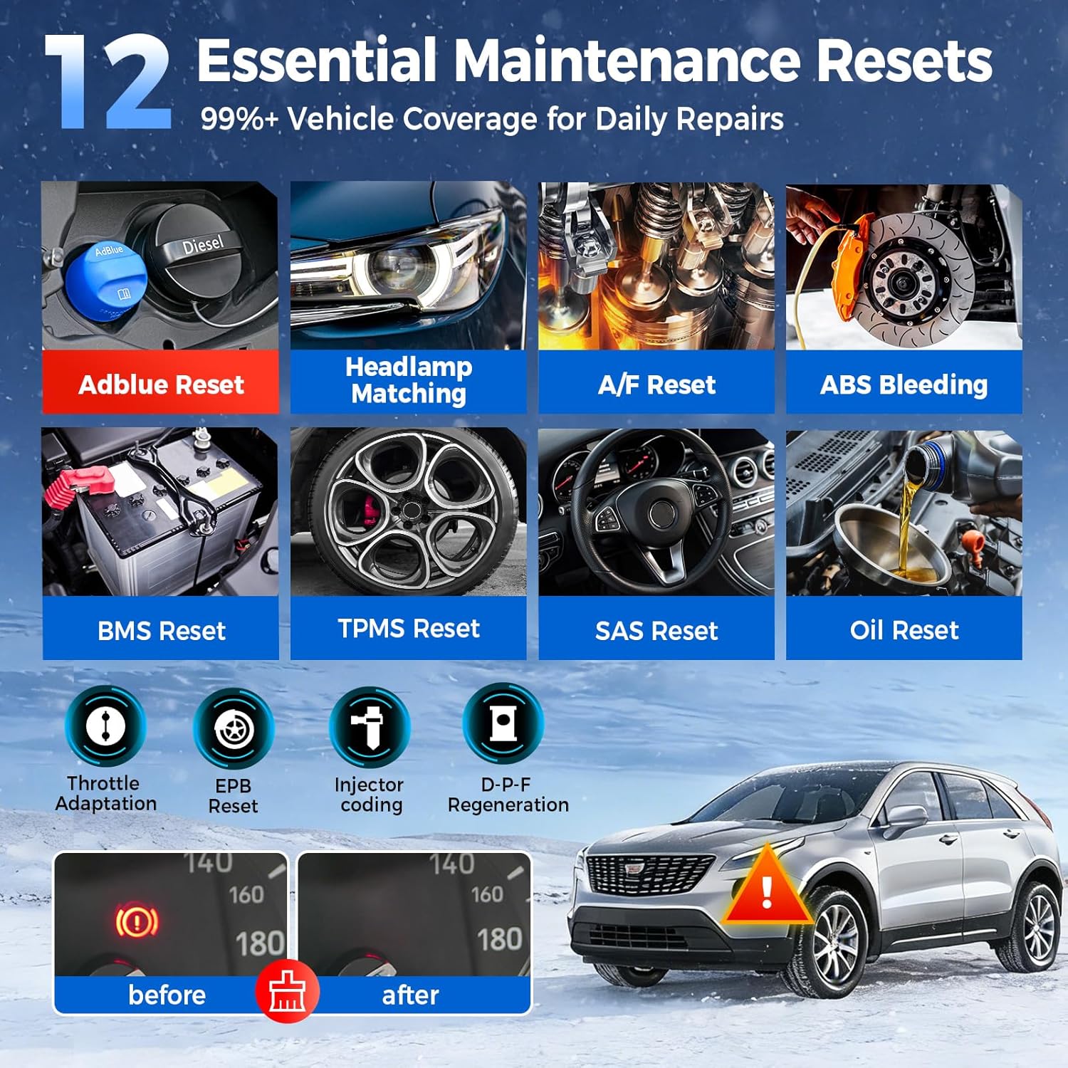 [Same Price 12 Free Reset Services] LAUNCH CRP129X V3.0 OBD2 scanner diagnostic tool now offers 12 popular OE level services to give you more repair solutions: Oil Reset, Steering Angle Calibration, Electronic Parking Brake Reset, TPMS Reset, Throttle Adaptation, DPF Regeneration, Injector Coding, BMS Reset, AdBlue Reset, Headlamp Matching, A F Reset, ABS Bleeding. With this launch scanner, you can generate a vehicle health report with one click and share it with your mechanic to help analyze problems.